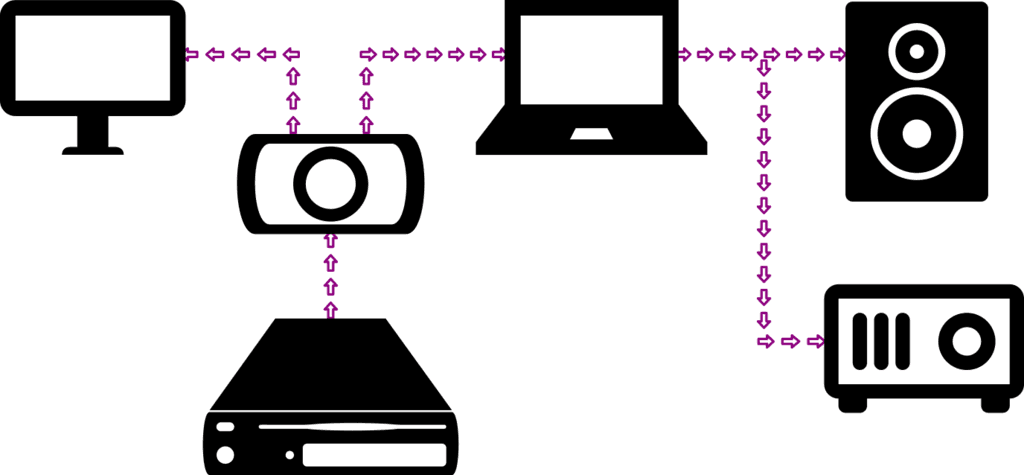 WiiU(左下)からの映像出力をキャプチャボードにつなぎ、パススルー出力をモニター(左上)に繋いで、モニターを見てプレイ。キャプチャボードのPC側出力は普通にPCにつなぎ、専用キャプチャソフトで拾う。PCからは普通に画面・音声出力をそれぞれプロジェクタ・スピーカー(右)につなぐと、観戦スクリーン(音声つき)が完成だ。