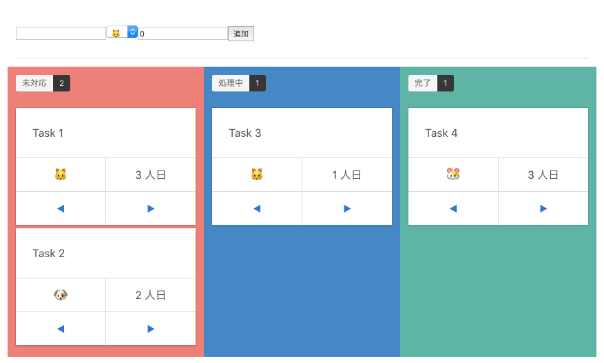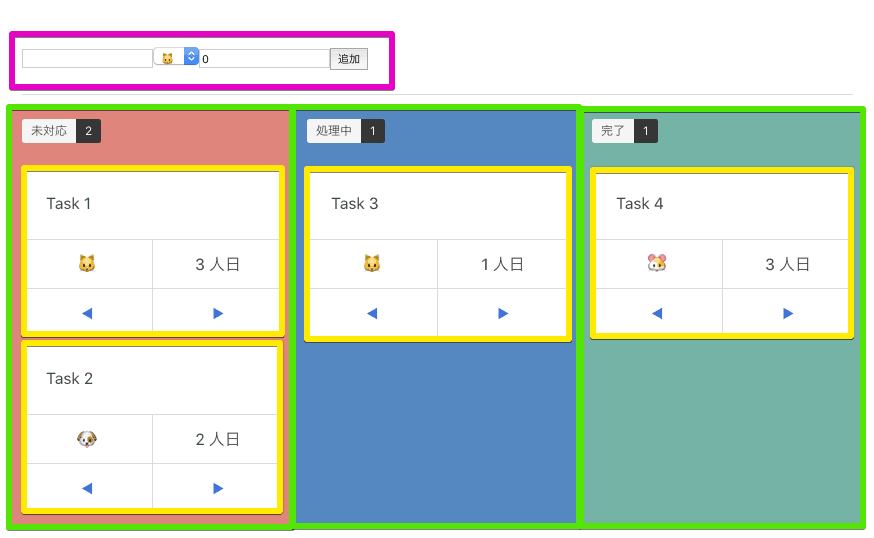 今日は、黄色で囲った「Task」の部分をコンポーネント化してみたのでその部分について書く。