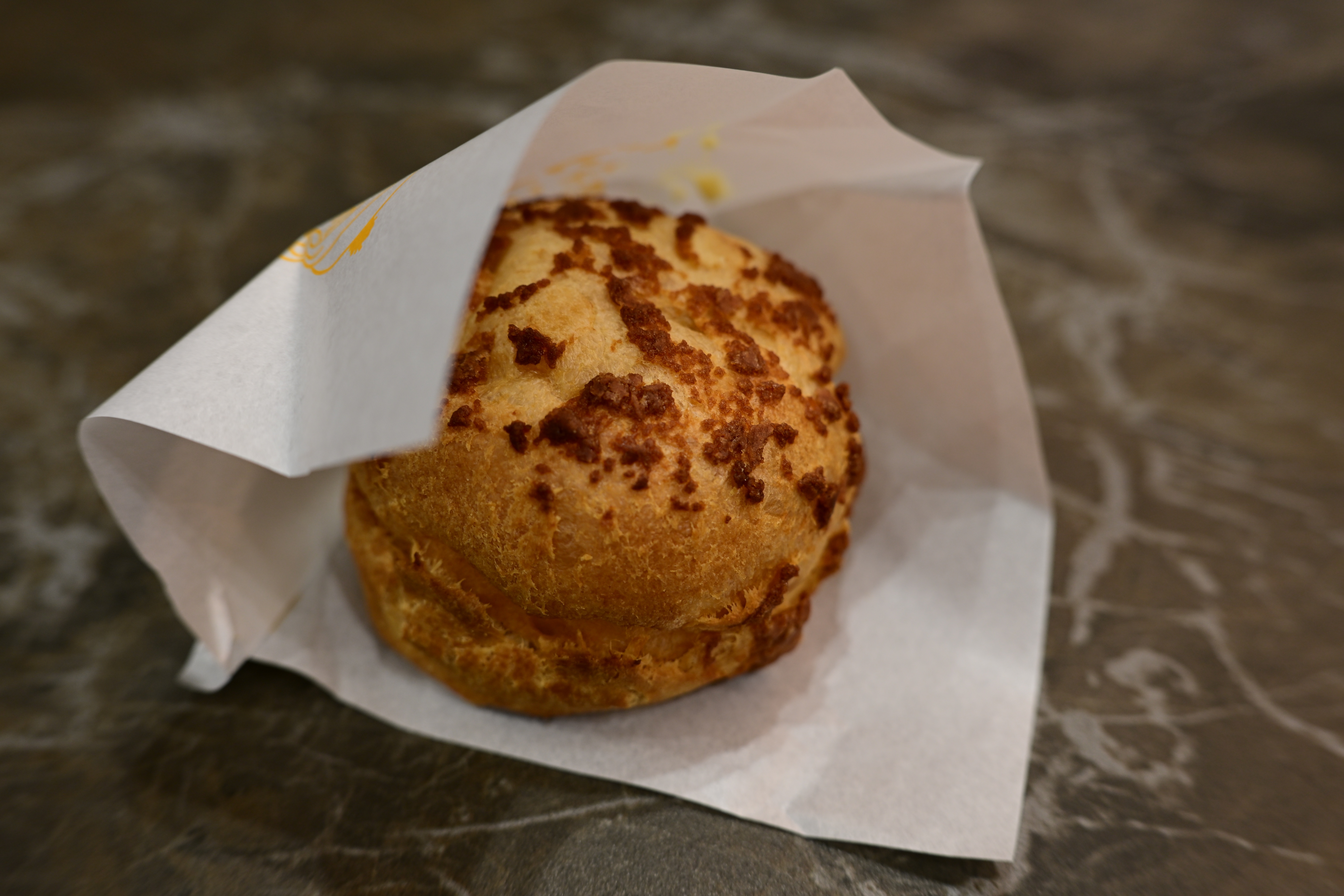 『紙に包まれたクッキー生地のシュークリーム』